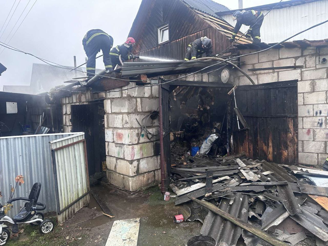 В результате пожара гаража уничтожена кровля, потолочное перекрытие, повреждены стены, имущество.