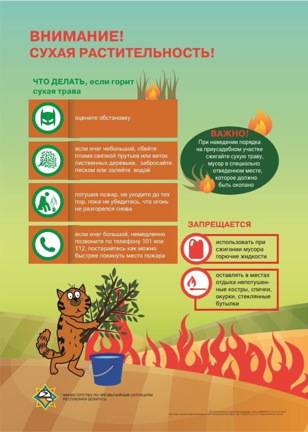 МЧС настоятельно напоминает о недопустимости выжигания сухой растительности. Это не только опасно, но и строго запрещено. Нарушителям грозит административная ответственность в виде штрафа от 10 до 30 базовых величин согласно ст. 16.40 КоАП Республики Беларусь.